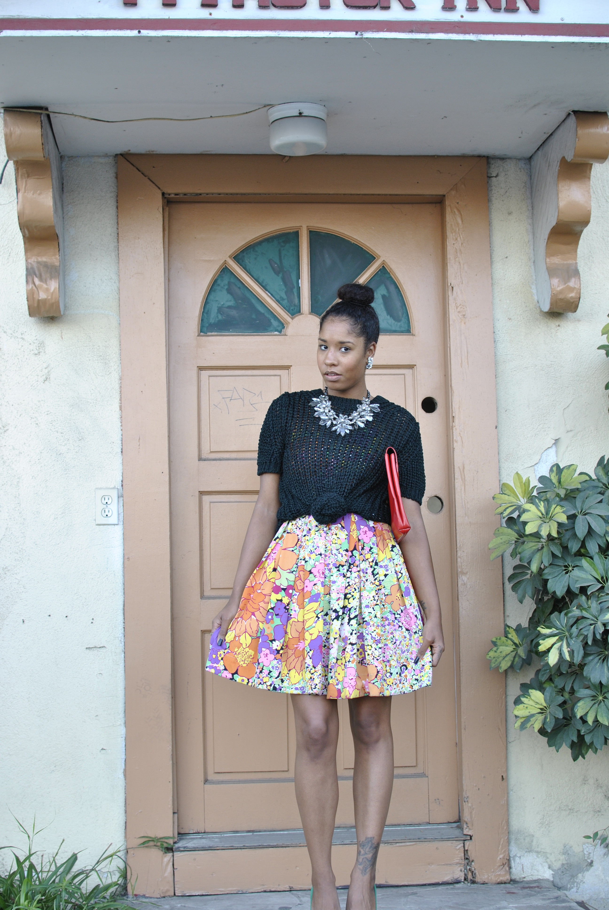 The weather in LA has been reminiscent of a southern springtime, so I decided to pull out the florals. This dress (that I turned into a skirt) has been a wardrobe favorite of mine for about 6 years, and it still has not lost its luster. I paired it with a dark green sweater I scored from Zara last week (it was only $8.99!!), and my new Karmen pumps from Just Fab. I wore this ‘fit to my first Blogger Babes event last night, and I had such an amazing time. Stay tuned for pictures and my thoughts on the Blogger Babes Pow Wow.