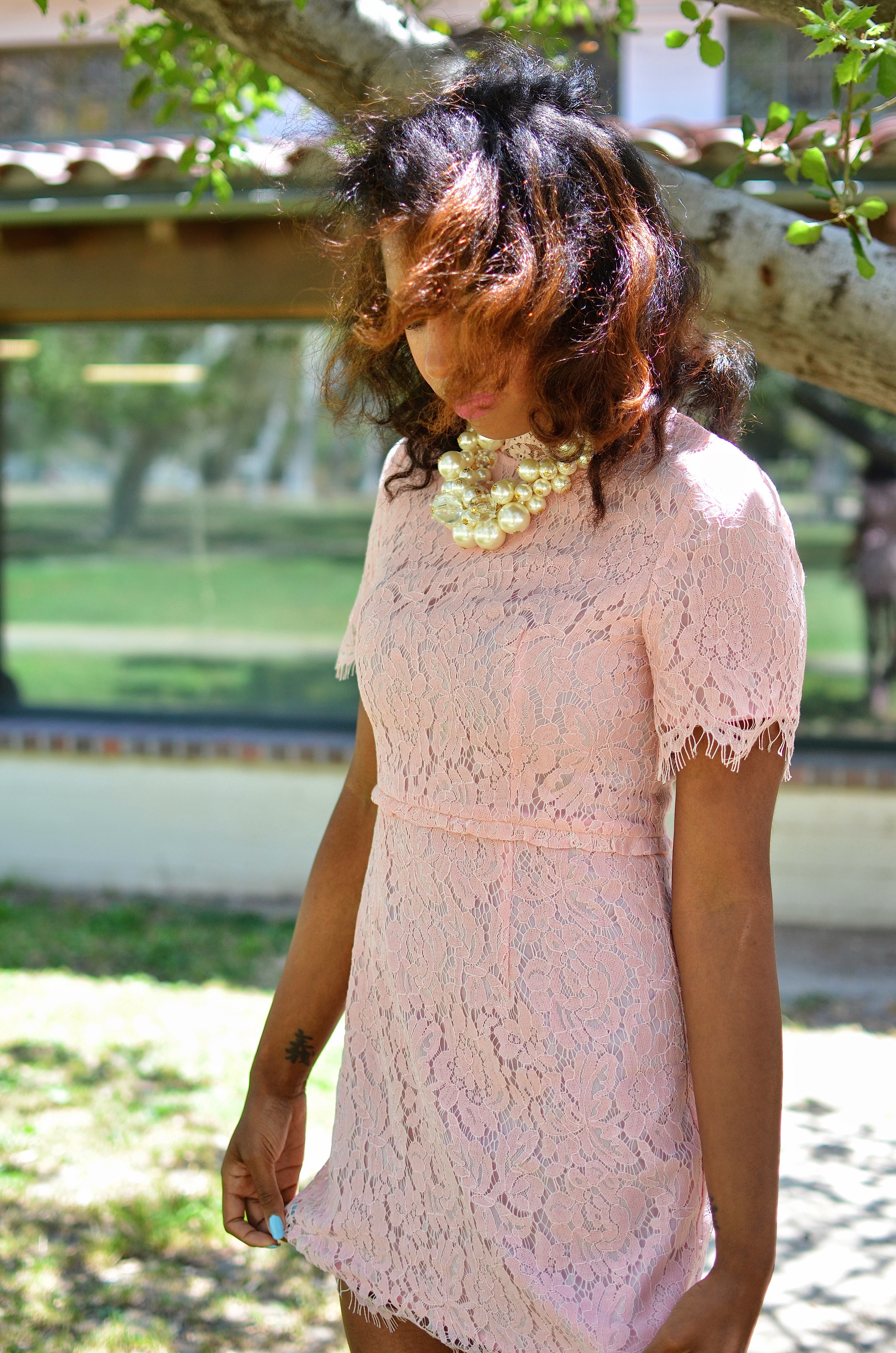 Feminine, romantic, and girly are not my usual go-to adjectives when I’m deciding on an outfit. However, when I saw this Royal Pink Lace Dress with Scallop Hem from MsTingLee I fell in love with it. The cut and the lace details made me instantly feel like a lady. What better way to accessorize such a romantic dress than with pearls?